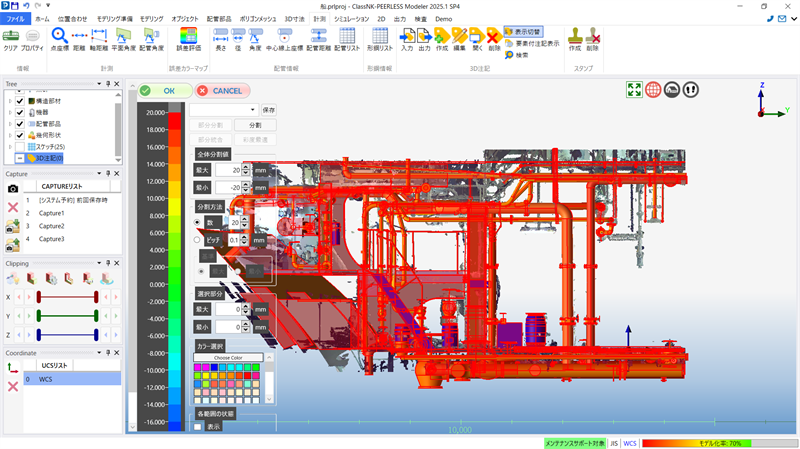 ClassNK-PEERLESSで作成したモデルが点群データに対してどの程度の精度で作られているかをカラーマップ表示から確認できます。