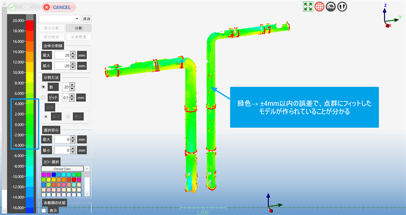 ただ、作成した配管を誤差評価してカラーマップ表示することで、膨らんでいる箇所やへこんでいる箇所など点群とモデルに誤差があるところが分かり、配管の状態を確認することができますので、維持管理に役立ちます。