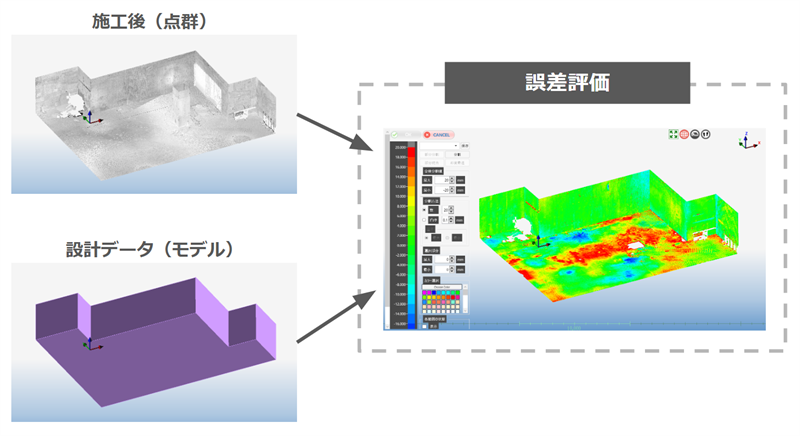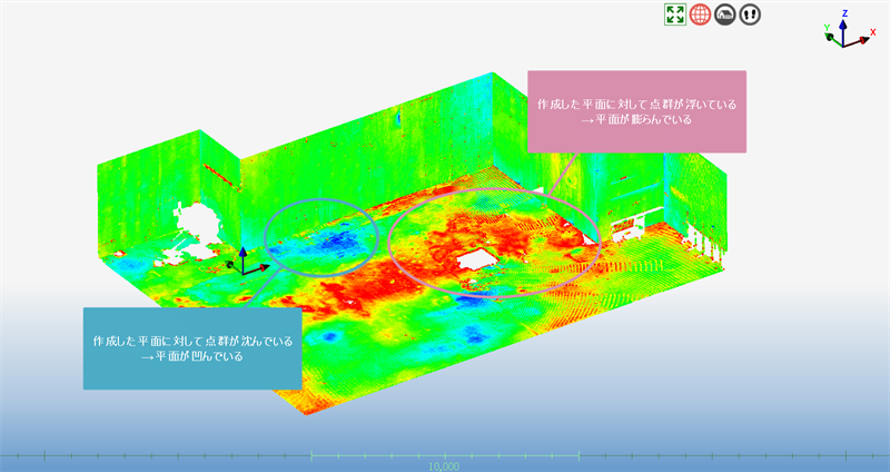 そのため、誤差評価機能で点群との誤差をカラーマップ表示することで実際の面にある凹凸を確認できます。