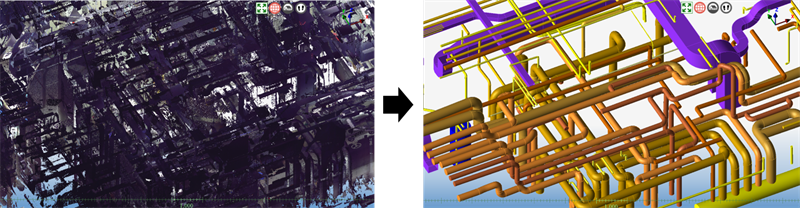 津川様:基本的に既設改造の際の干渉チェック、配管のルート変更、建屋内に新設する機器の検討等の案件で、モデル化を必要とする場合に使用します。例えば、50年前のプラント設備など図面が無い案件の場合や AutoCAD や Plant3D に既設モデルを持っていきたいときに必要になります。モデルをもとに、他の3D入力できるCADソフトへ受け渡しすることも簡単なので、非常に便利です。