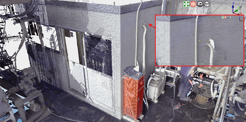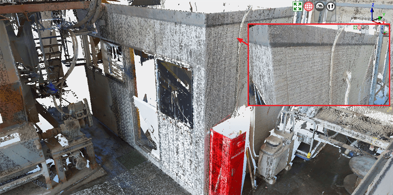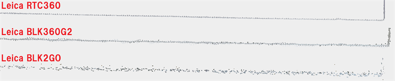 詳細に確認すると、Leica RTC360とLeica BLK360 G2の点群データには違いがありますが、ざっくりと見た感じではあまり違いが出ませんでした。Leica BLK2GOの点群データは、見た目に加え、点群の厚みも違いがハッキリと出ました。