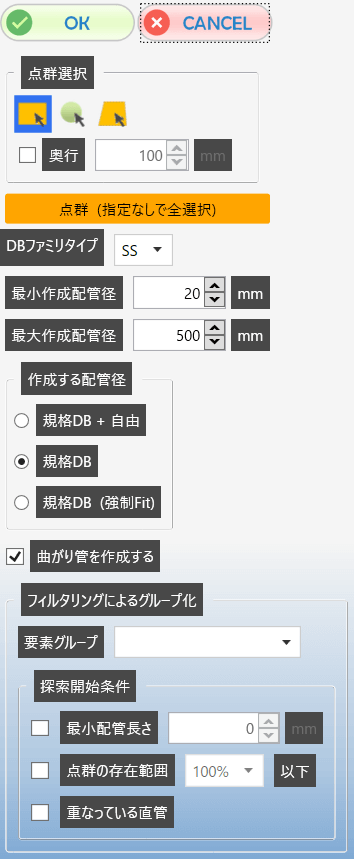 Cでは径の大きい管は認識しやすかったですが、小径管だとうまく認識しないことがありました。(例:サイズが異なる、曲がり部分の手前で認識が止まってしまう)