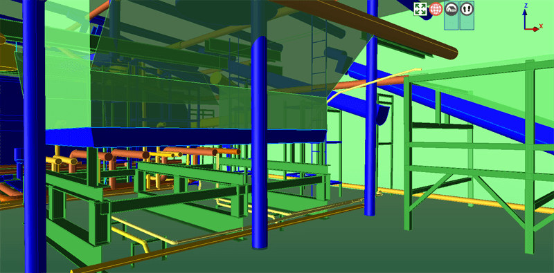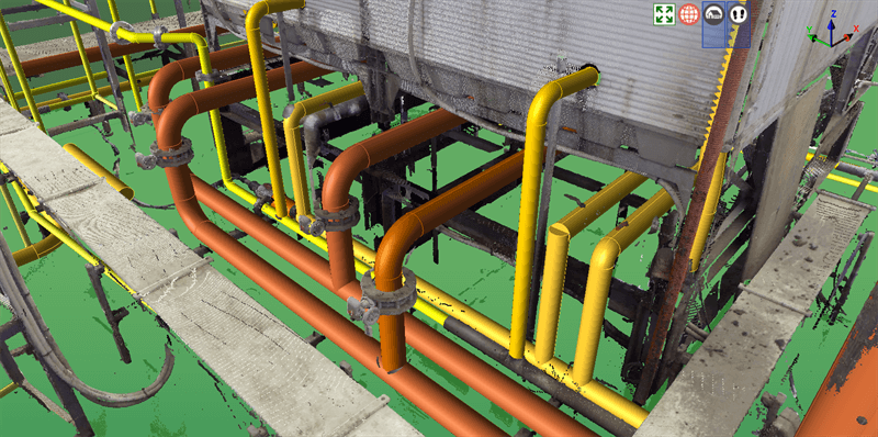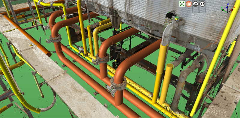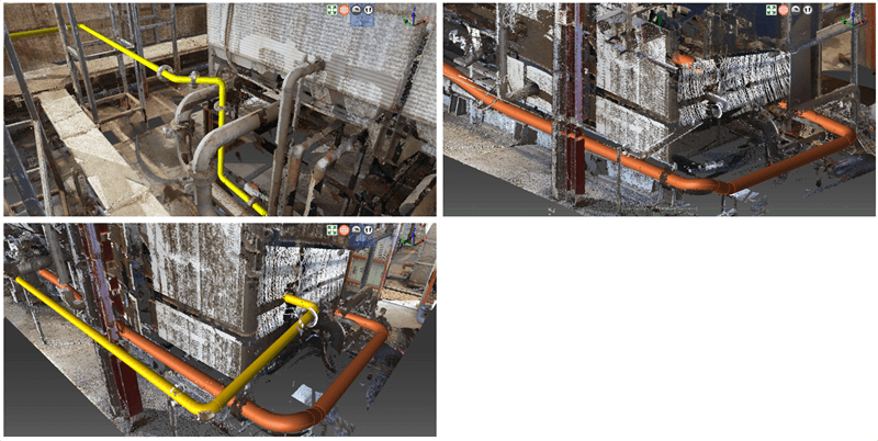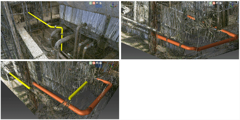 ClassNK-PEERLESSでは上述の自動認識機能の他に、点群を塗ることで、部材を1つずつ認識させ規格に合った形でモデル作成する機能もあります。直管部分を一部塗るだけで配管を丸ごと1本作成する機能を使って認識させた結果がこちらになります。