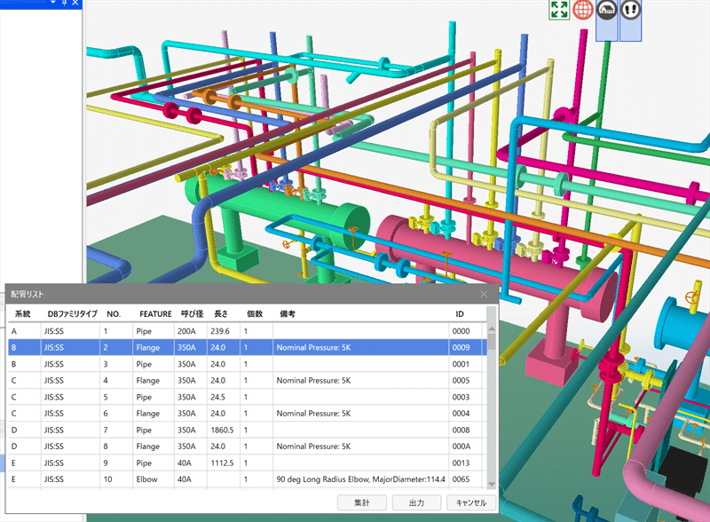PEERLESSの数量算出機能により、配管や鋼材のサイズ・長さ・数量を自動で計算できます。算出結果はCSVで出力でき、概算見積に直結しています。