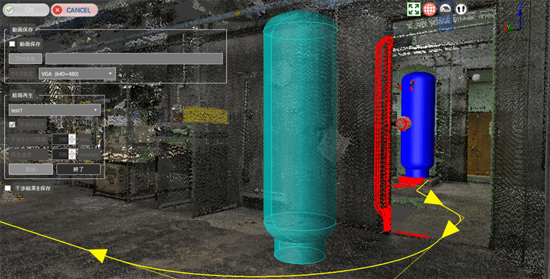 - [ルート探索]や[動的干渉チェック]により、施工前に干渉や搬入経路を確認