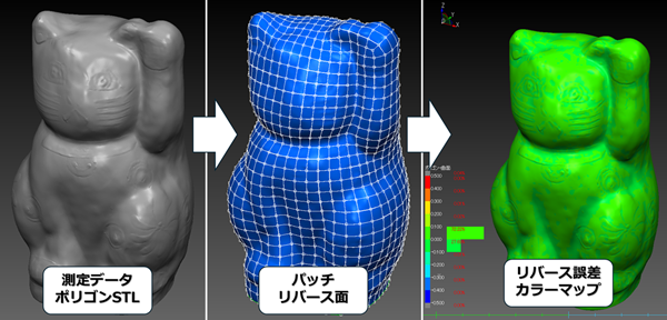 精度の検証と出力:作成した面と元の点群との誤差確認(カラーマップ)、およびCAD形式(IGES等)へのエクスポート
