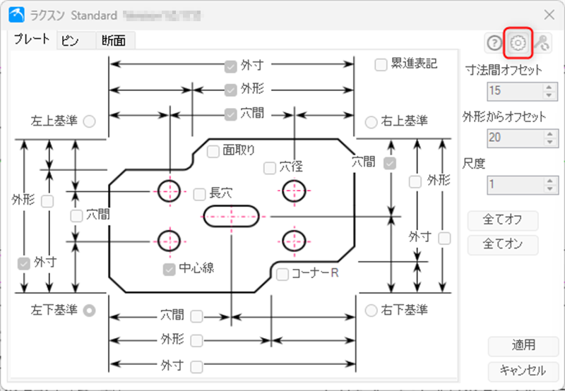 ダイアログの右上の歯車マークのボタンよりユーザー設定が可能です。チェックの初期値を指定すると次回コマンド起動時より反映されます。