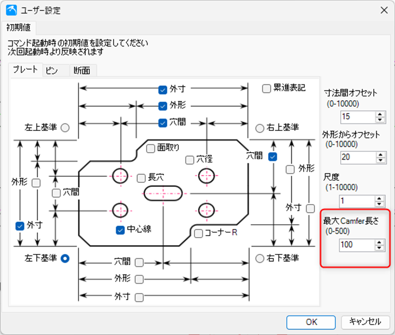 2)[プレート]タブの右側の「最大Chamfer長さ」の値に実際のC面より大きい値を入力します。