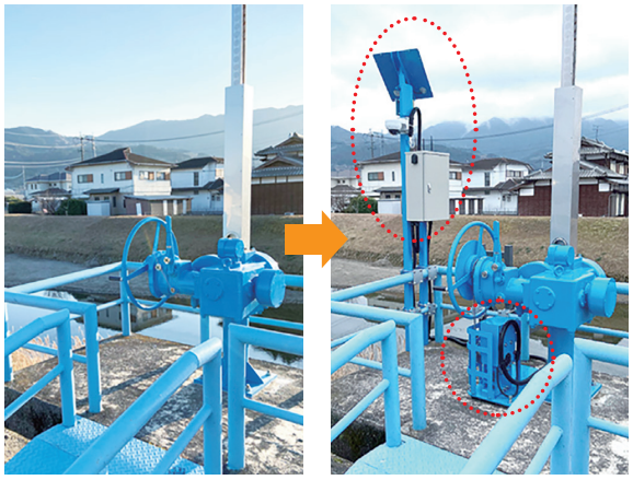 「水門ボット」は、河川や農業水路の手動水門に後付けすることで、水門開閉の自動化や遠隔操作を実現する製品です。スマートフォンやパソコンからの遠隔操作が可能になるため、ゲリラ豪雨などの急な増水時や夜間対応時の安全性向上・負担軽減につながります。さらに、雨量センサーや水位センサーとの連携で水門を制御できるため、水害にも迅速に対応できます。